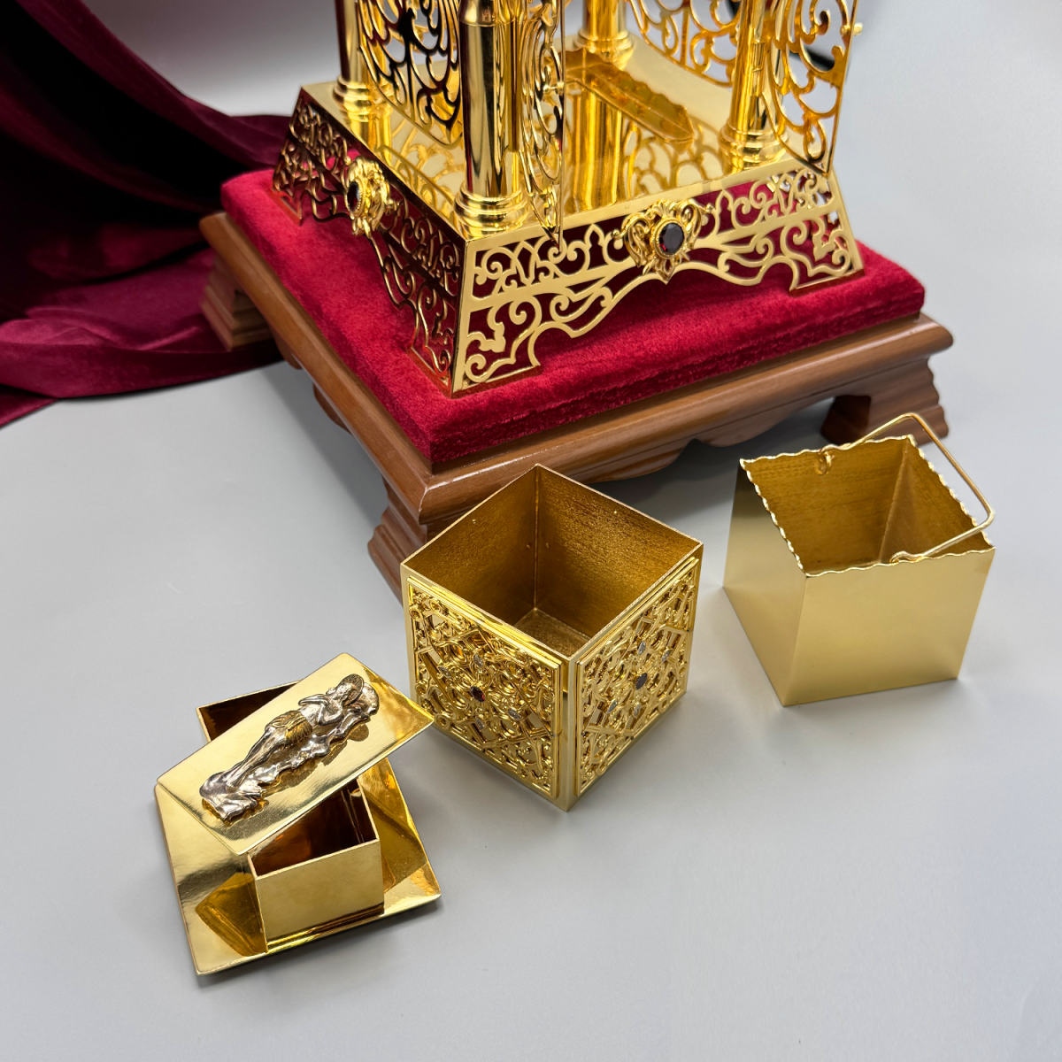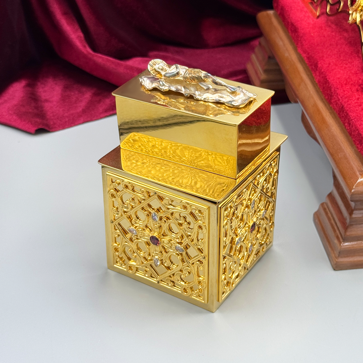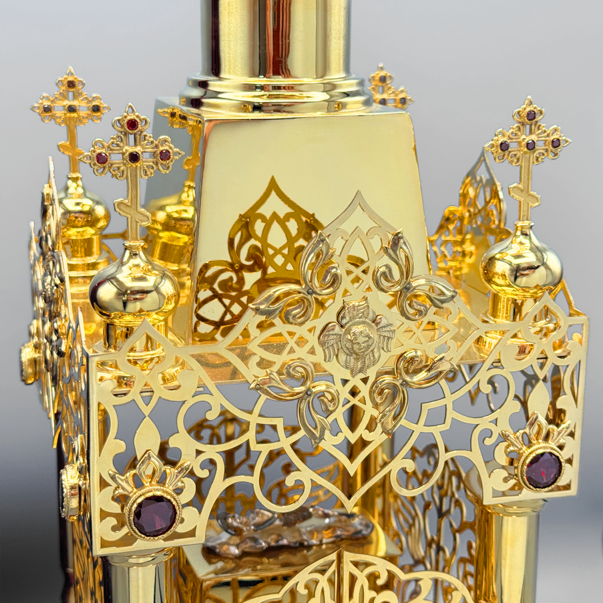 - Дарохранительница латунная с красными камнями в позолоте 2.7.1515лп-К