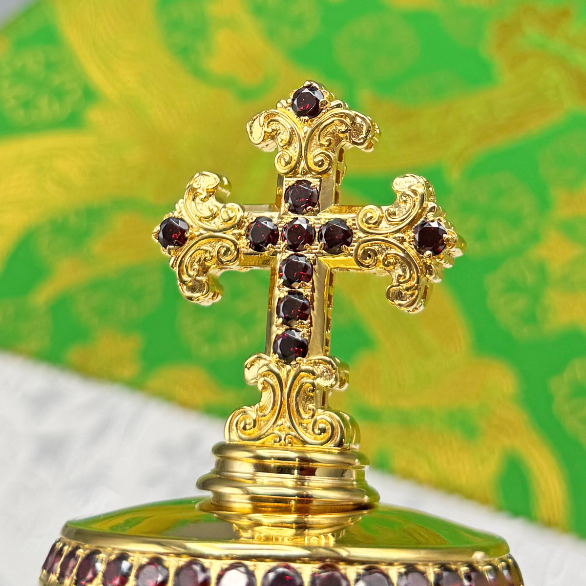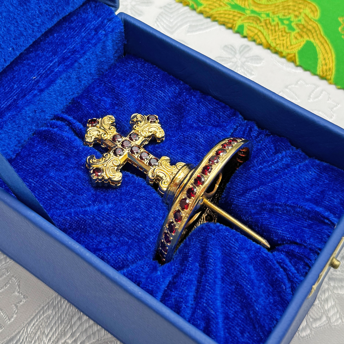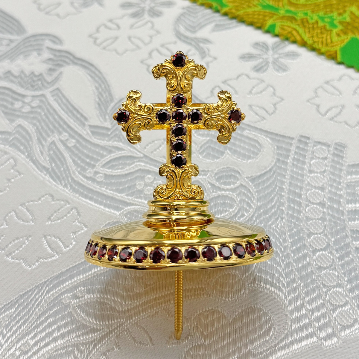 Крест на митру изготовлен из латуни и покрыт качественной позолотой, которая очень долго остается в неизменном виде. Изделие богато декорировано россыпью камней-фианитов ручной закрепки. Крест продается в презентабельной кожвиниловой упаковке с бархатным ложементом.