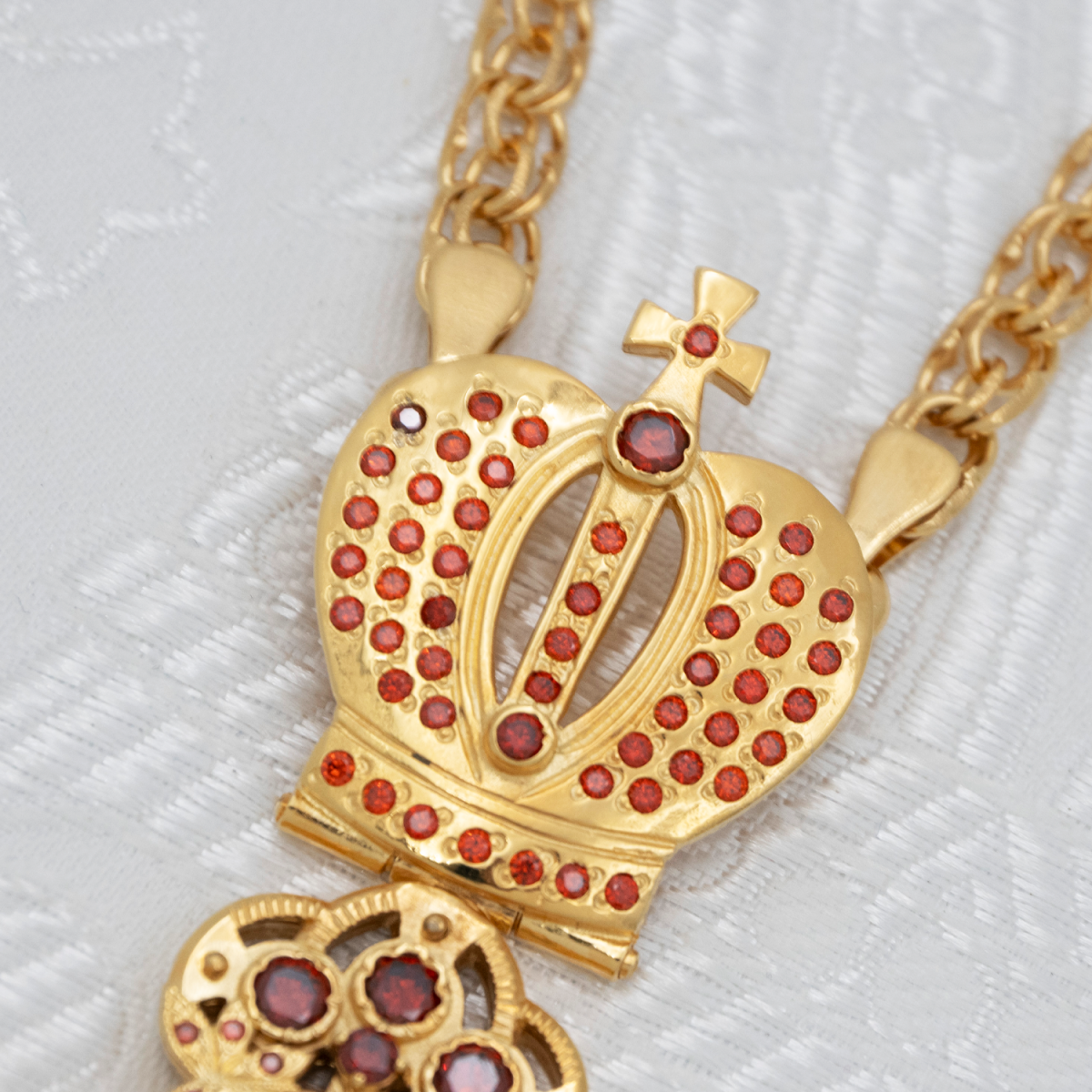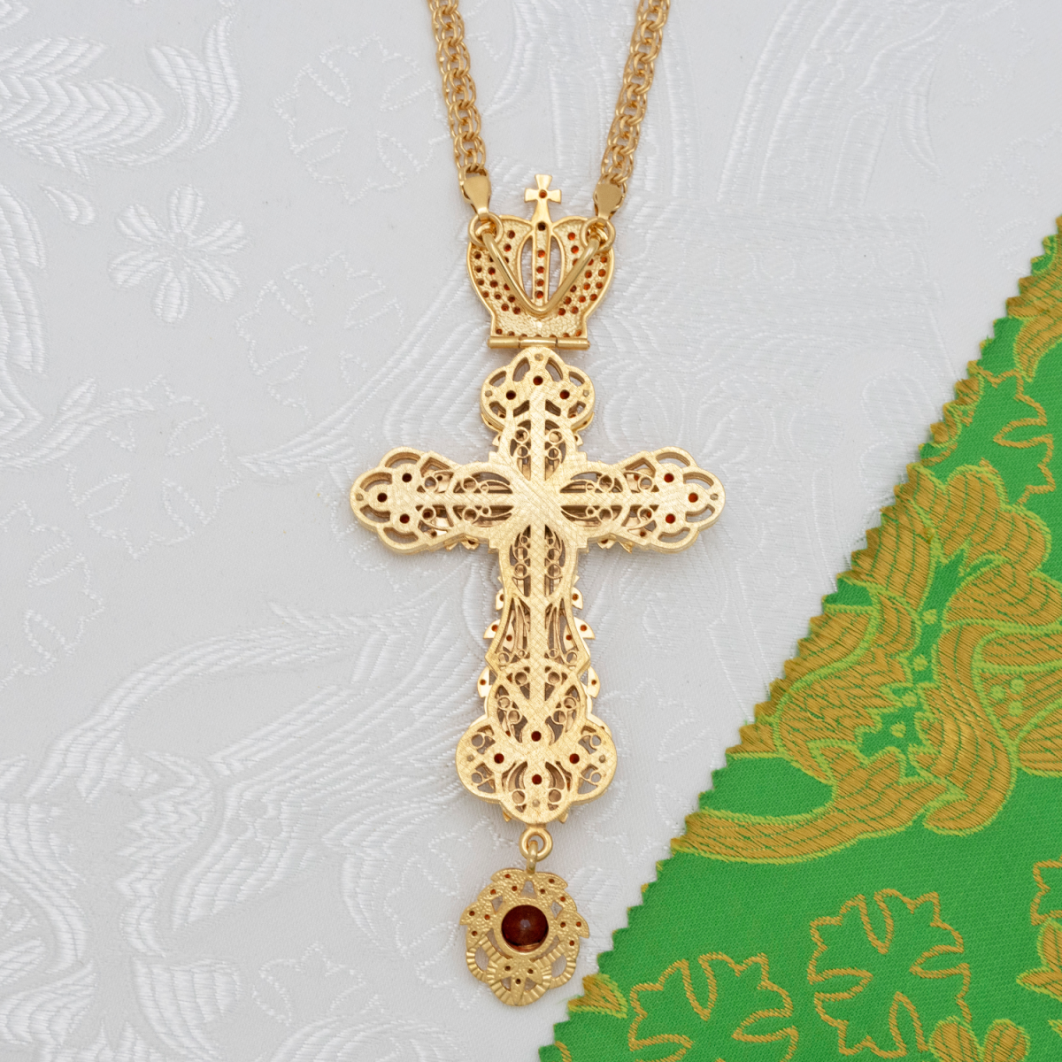 - Крест наперсный Ажурный из латуни с красными камнями в позолоте 2.10.0006лп/1лп