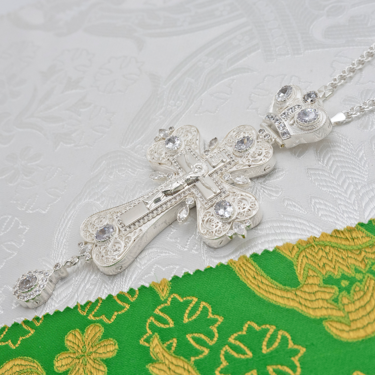 - Крест наперсный латунный с белыми камнями в серебрении 2.10.0556л/1л