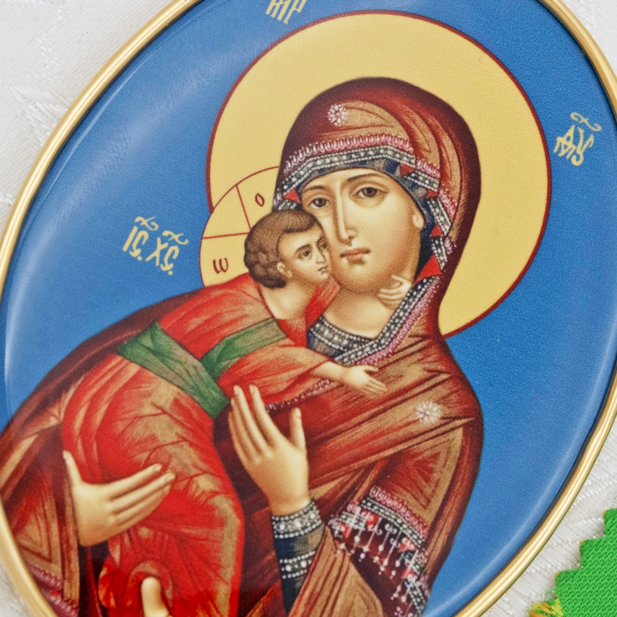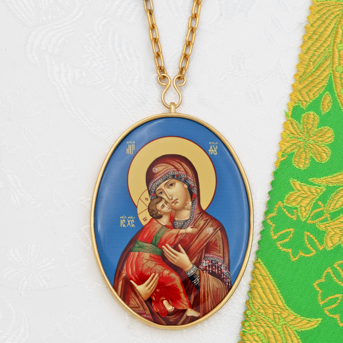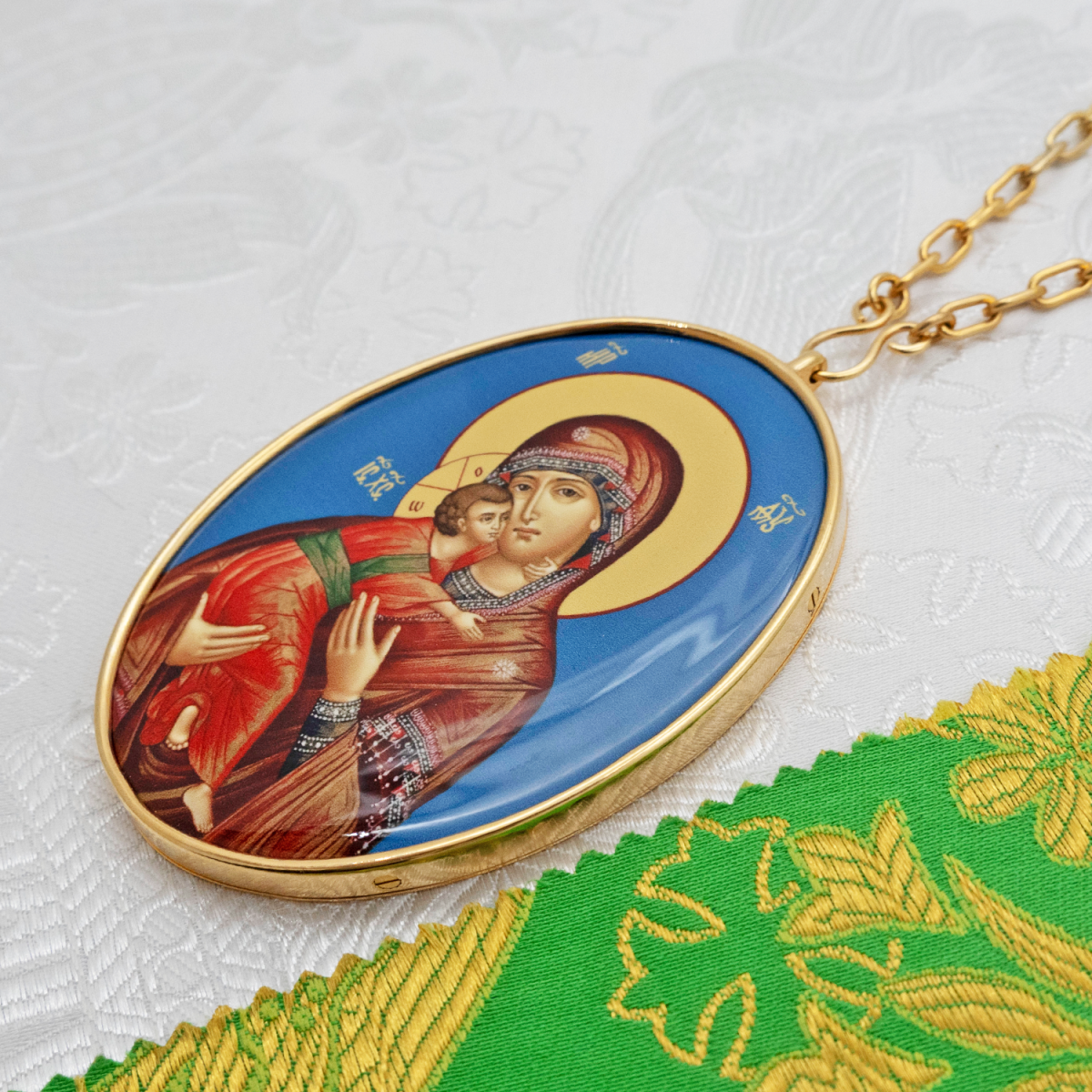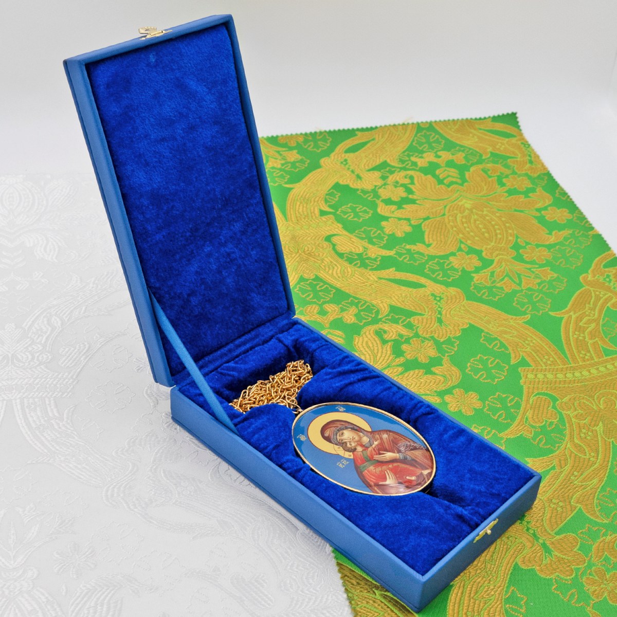 Панагия изготовлена из высококачественного ювелирного сплава, покрытого позолотой гальваническим методом. Такое покрытие продлевает срок службы изделия, защищает от внешних неблагоприятных воздействий. Образ на панагии выполнен по специальной технологии нанесения цветного изображения на металлическую основу. Он покрыт защитным составом, который предохраняет его от выгорания цвета и различных повреждений. Продается в фирменной упаковке из экокожи с бархатным ложементом.