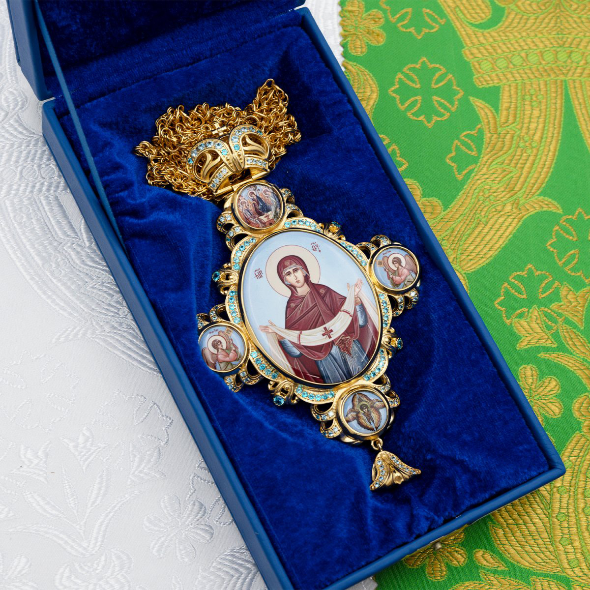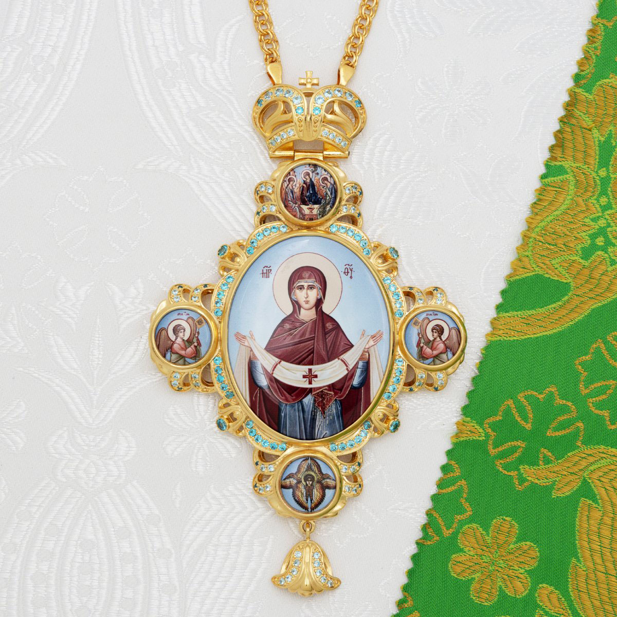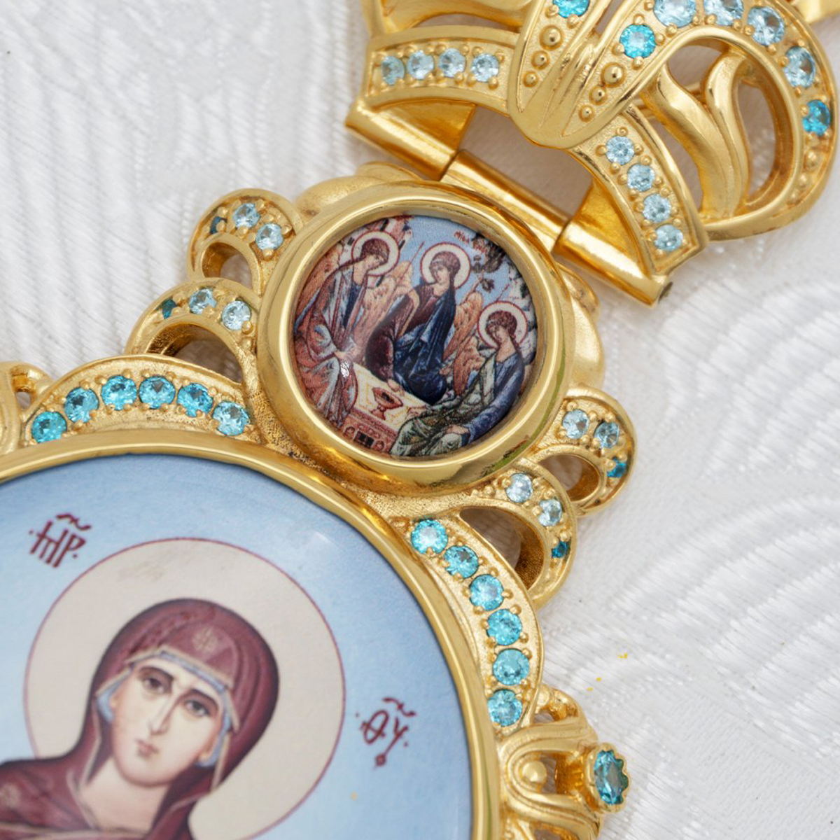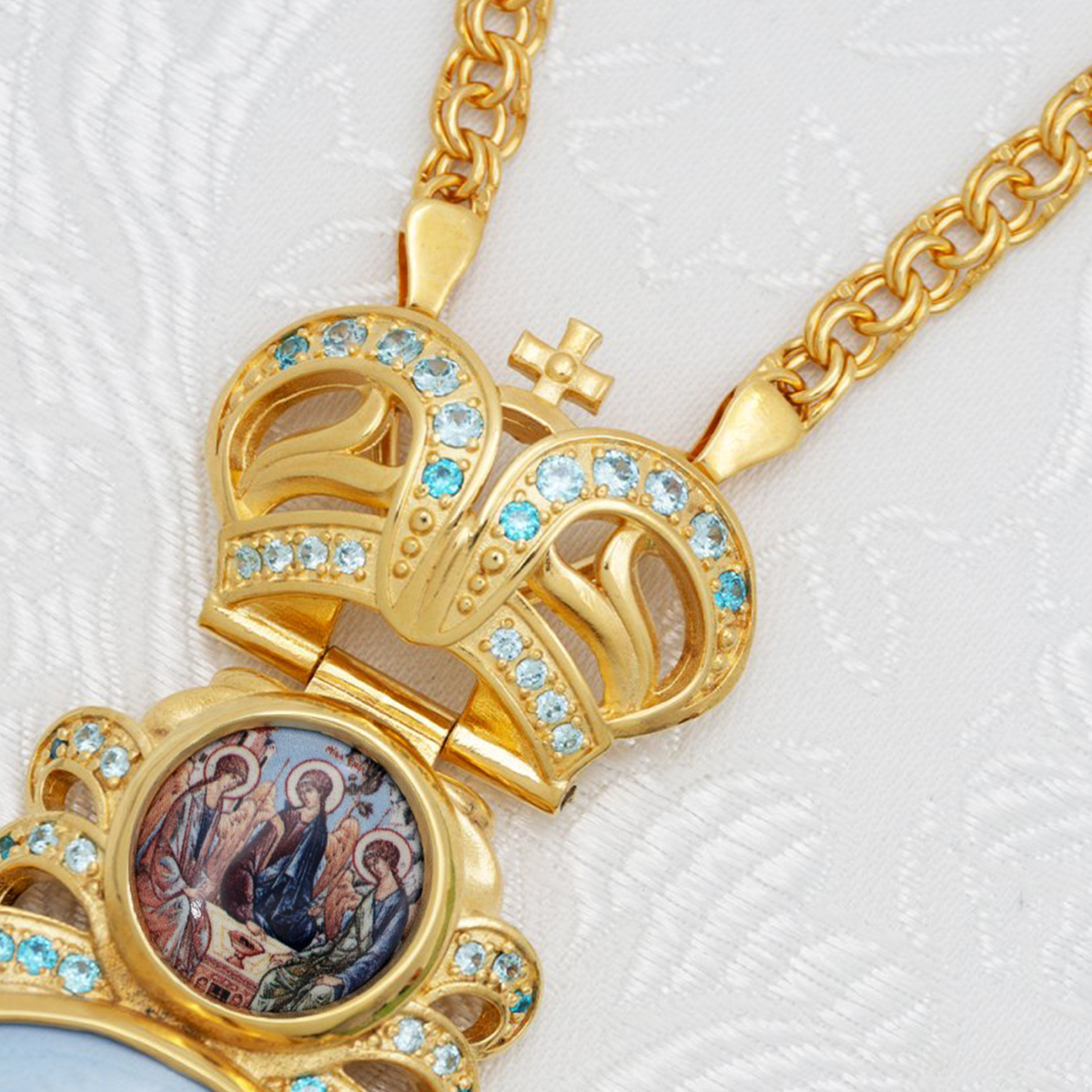 - Панагия латунная с голубыми камнями в позолоте с цепью