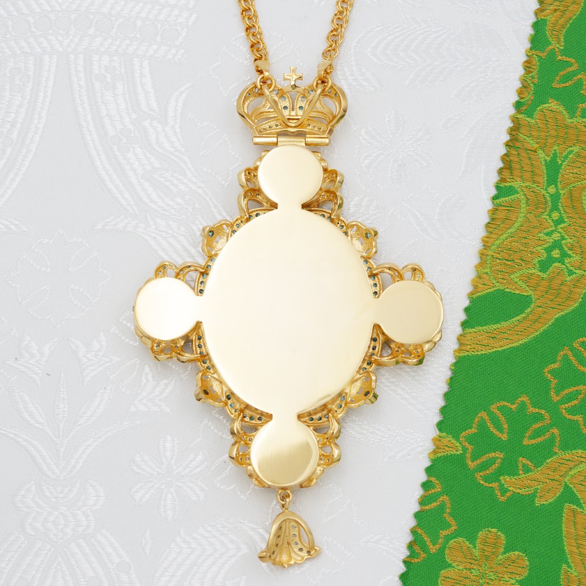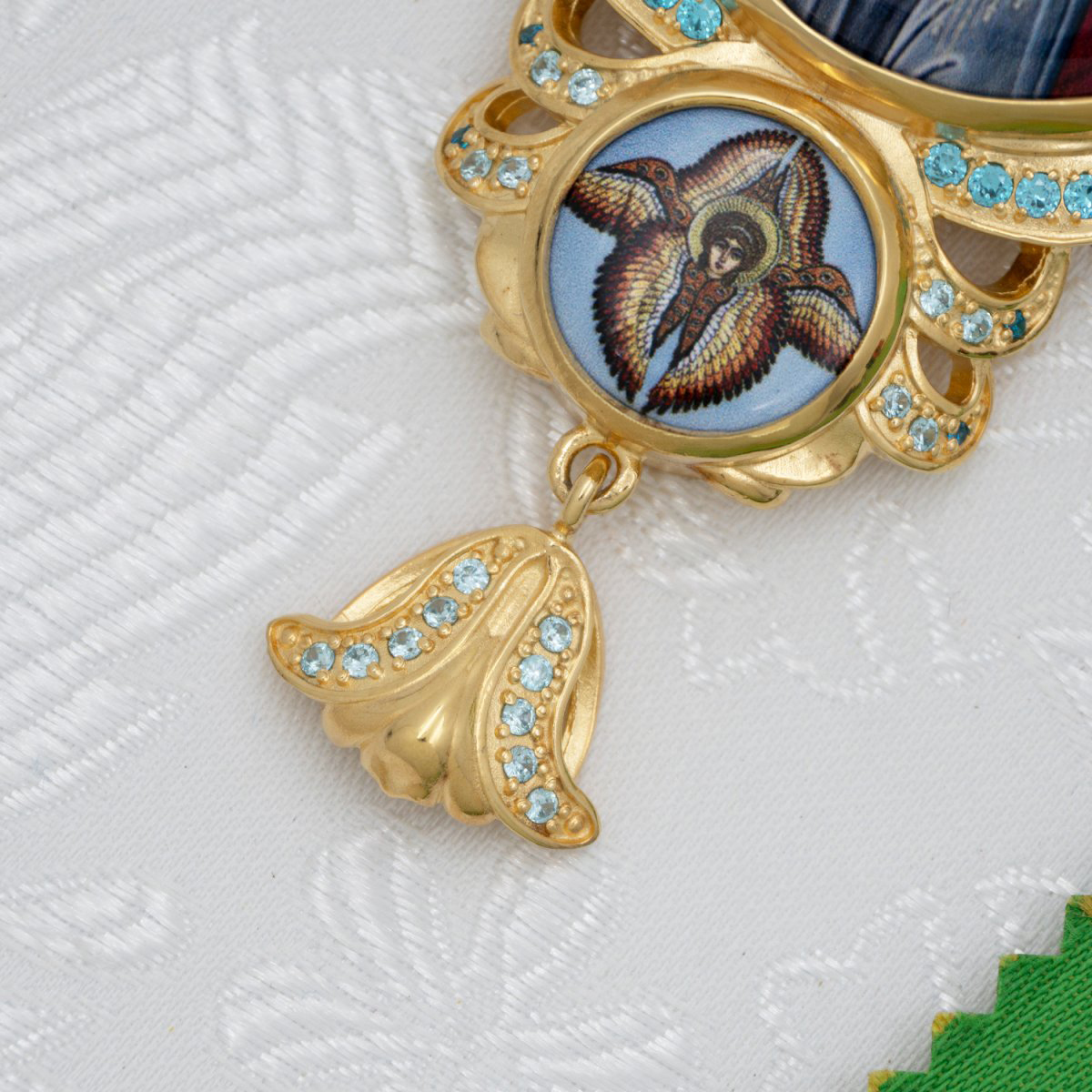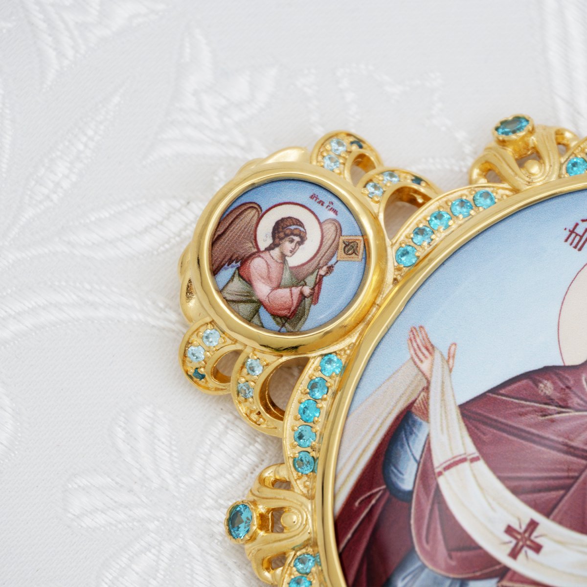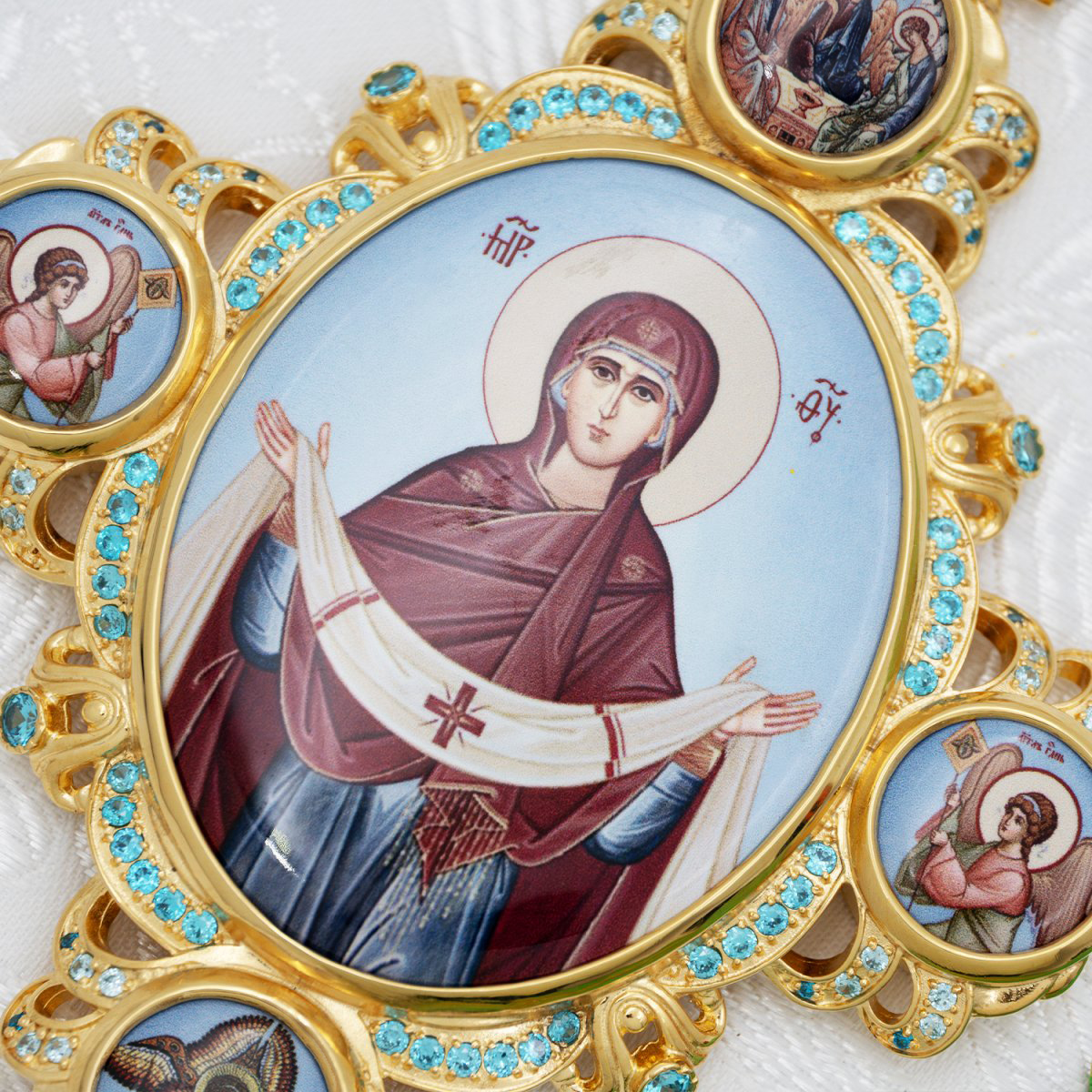 - Панагия латунная с голубыми камнями в позолоте с цепью