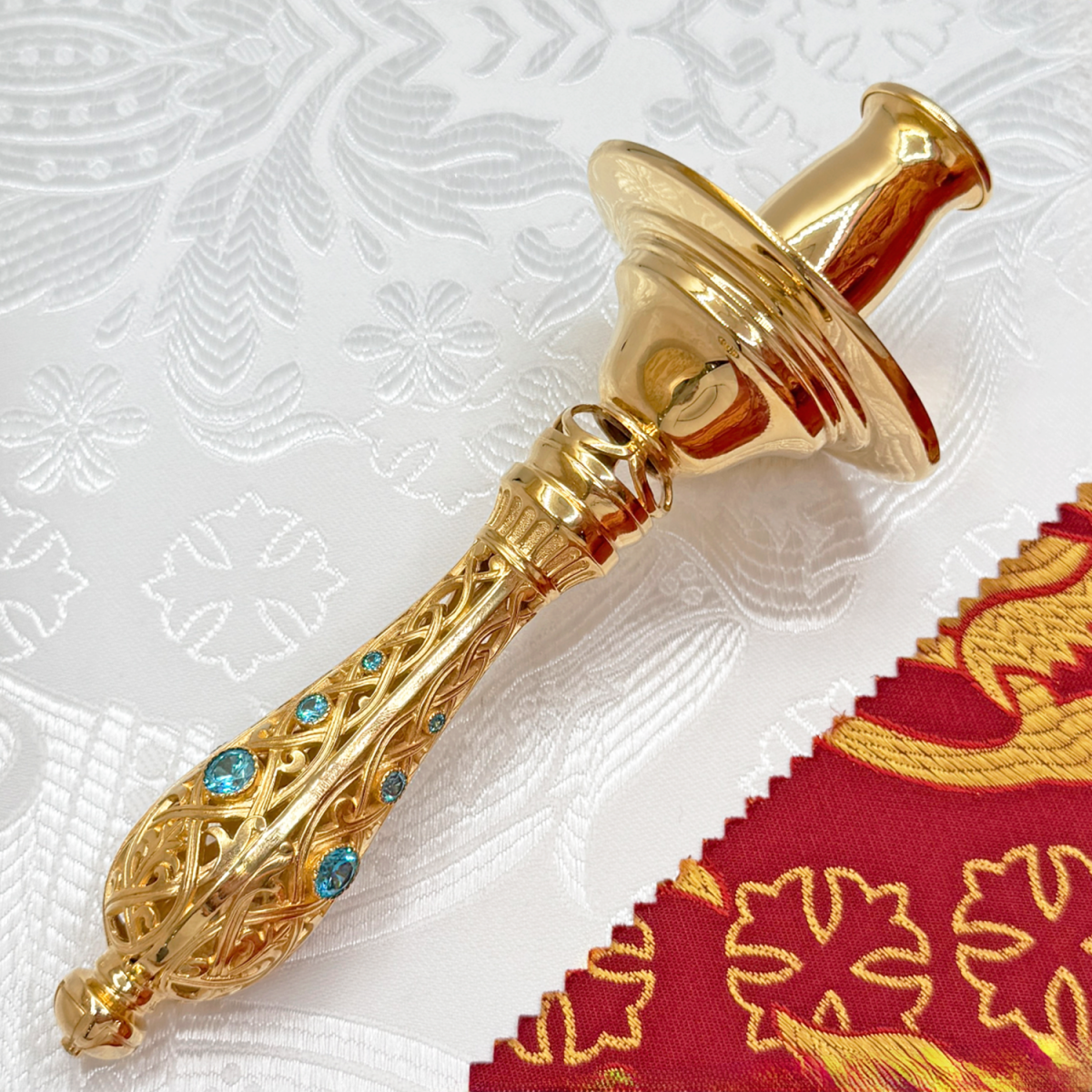 Ручной подсвечник из латуни с изящным декоративным узором и вставками сверкающих голубых камней. Выполнен с вниманием к деталям, он станет незаменимым атрибутом при проведении богослужений и церковных обрядов. Компактный и удобный в обращении, этот подсвечник гармонично дополнит вашу церковную утварь, придавая процессу молитвы особую торжественность и свет.