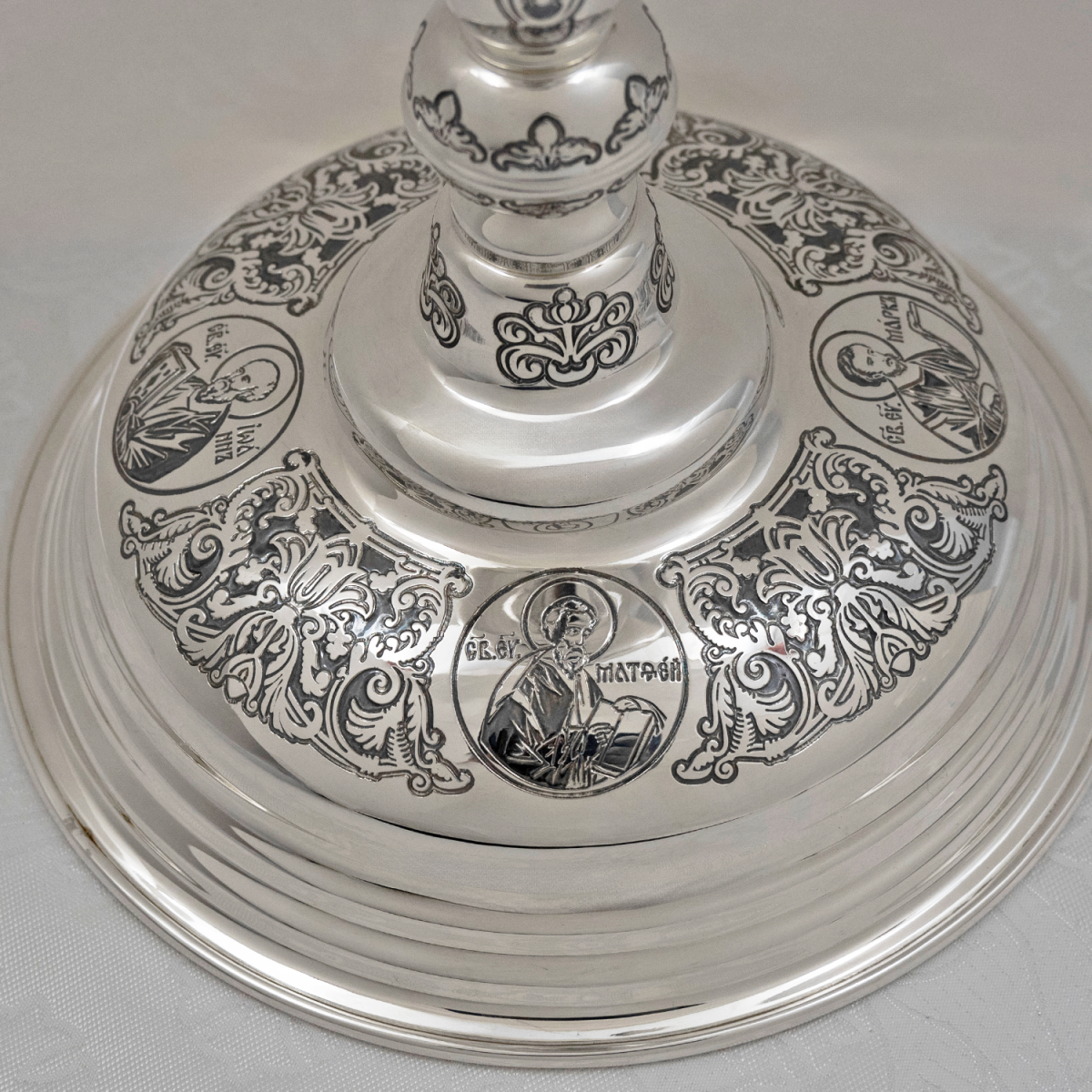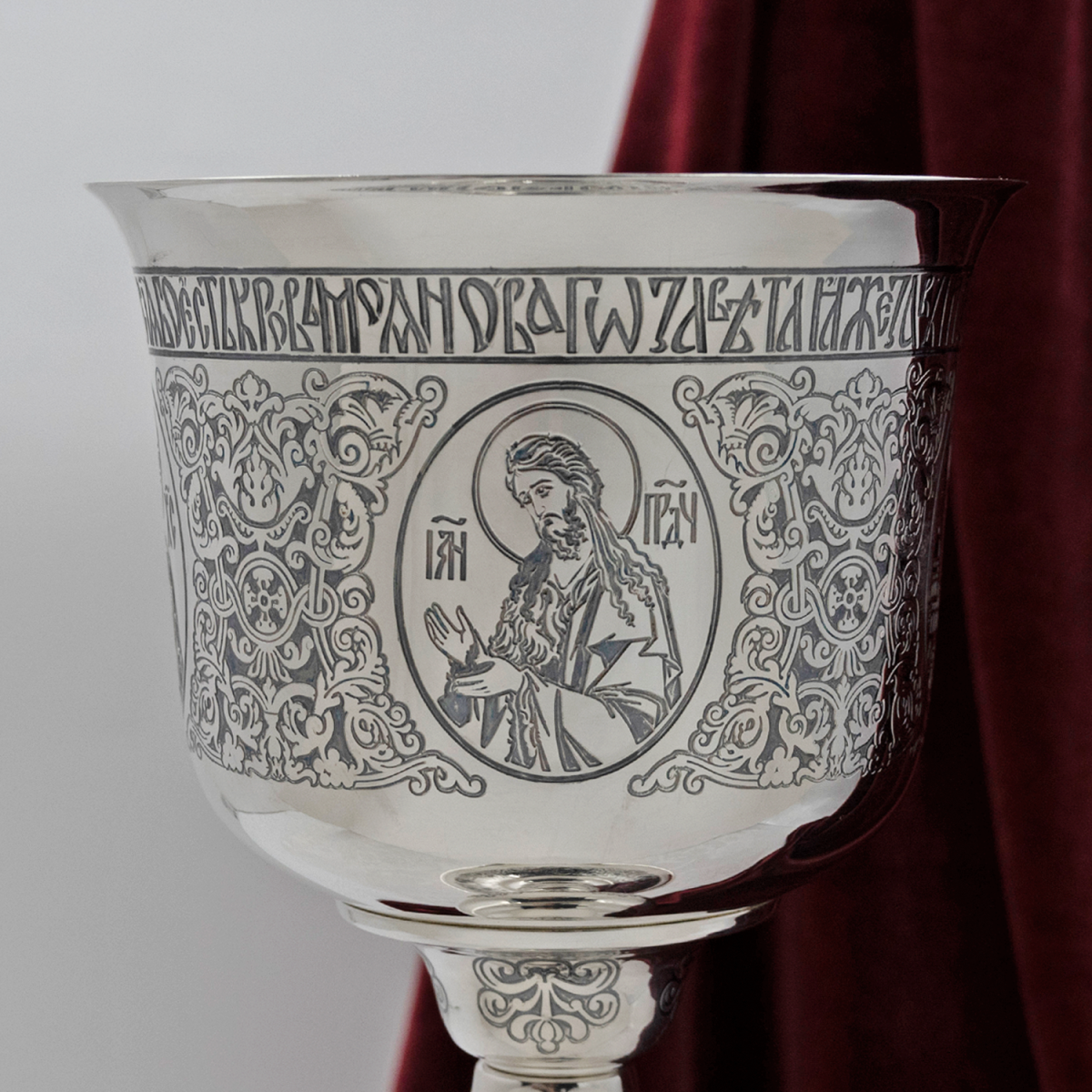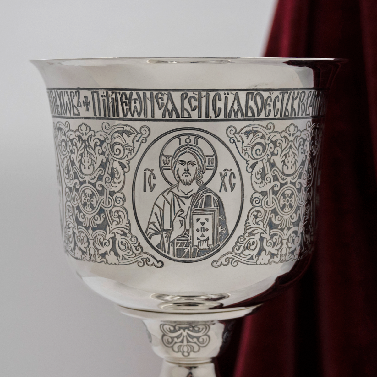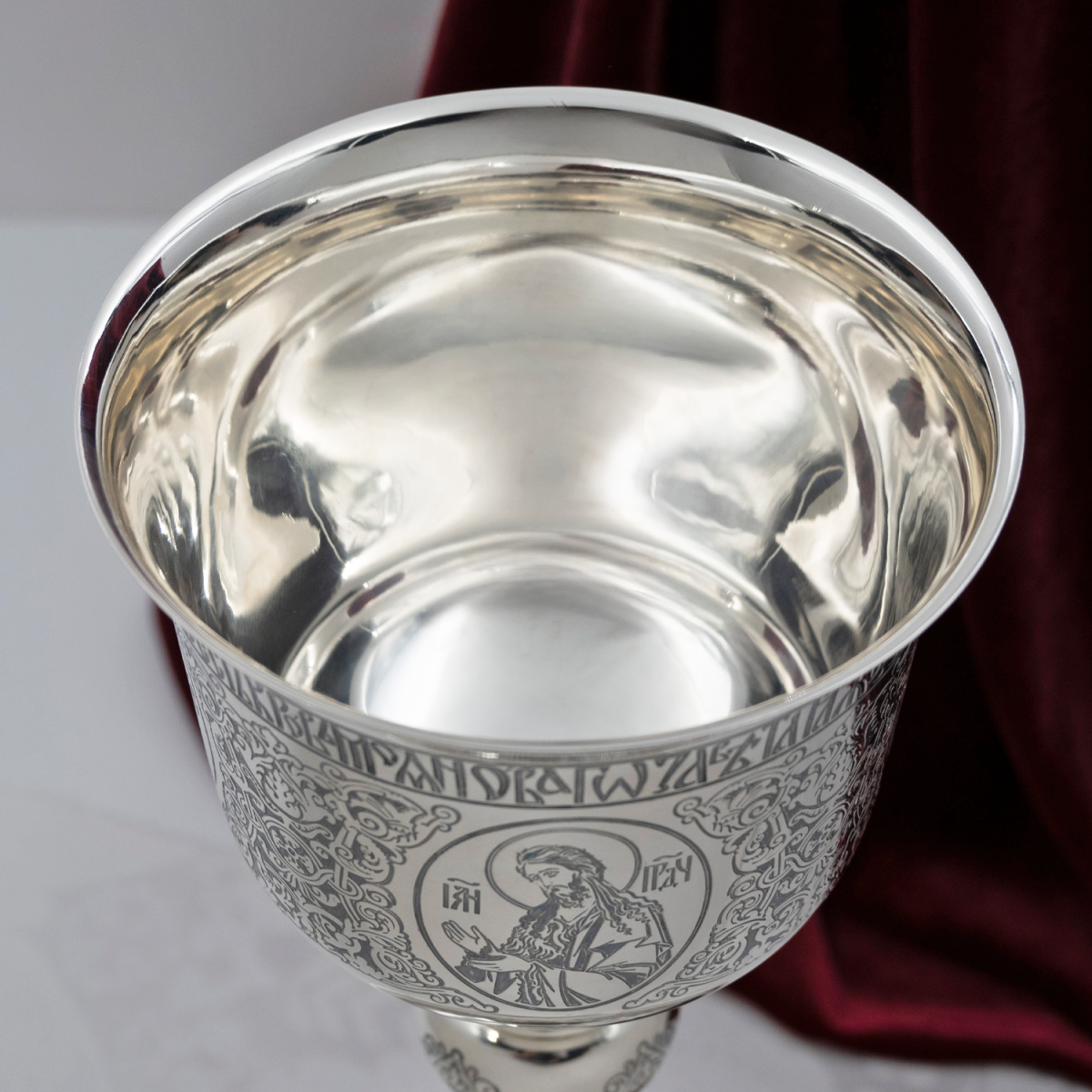 Потир лаконичного дизайна, объемом на 1,0 литр. Он покрыт долговечным серебрением при помощи передовой технологии – гальваника. За этим потиром просто ухаживать, чтобы вернуть ему первоначальный блеск, достаточно его просто натереть сухой мягкой тканью, после использования насухо вытирать и хранить без доступа влаги. Орнамент и каноничные надписи на потире выполнены при помощи глубокого травления, они не сотрутся со временем. Изделие созданное руками православных мастеров ювелиров с любовью и молитвой. Потир продается в презентабельной кожвиниловой упаковке с бархатным ложементом.