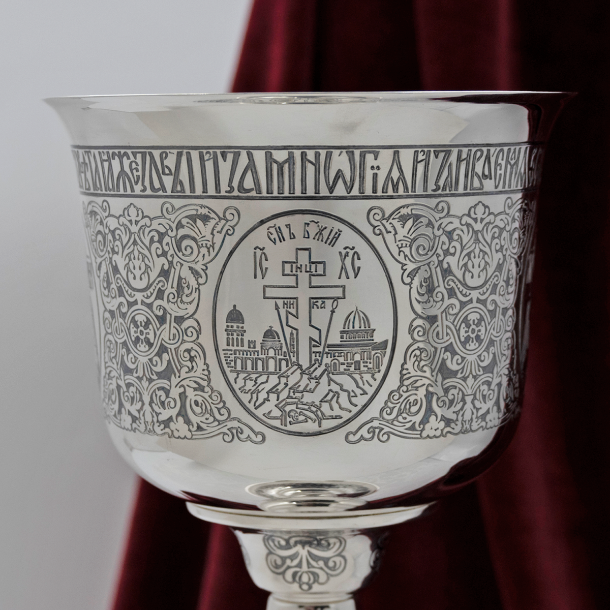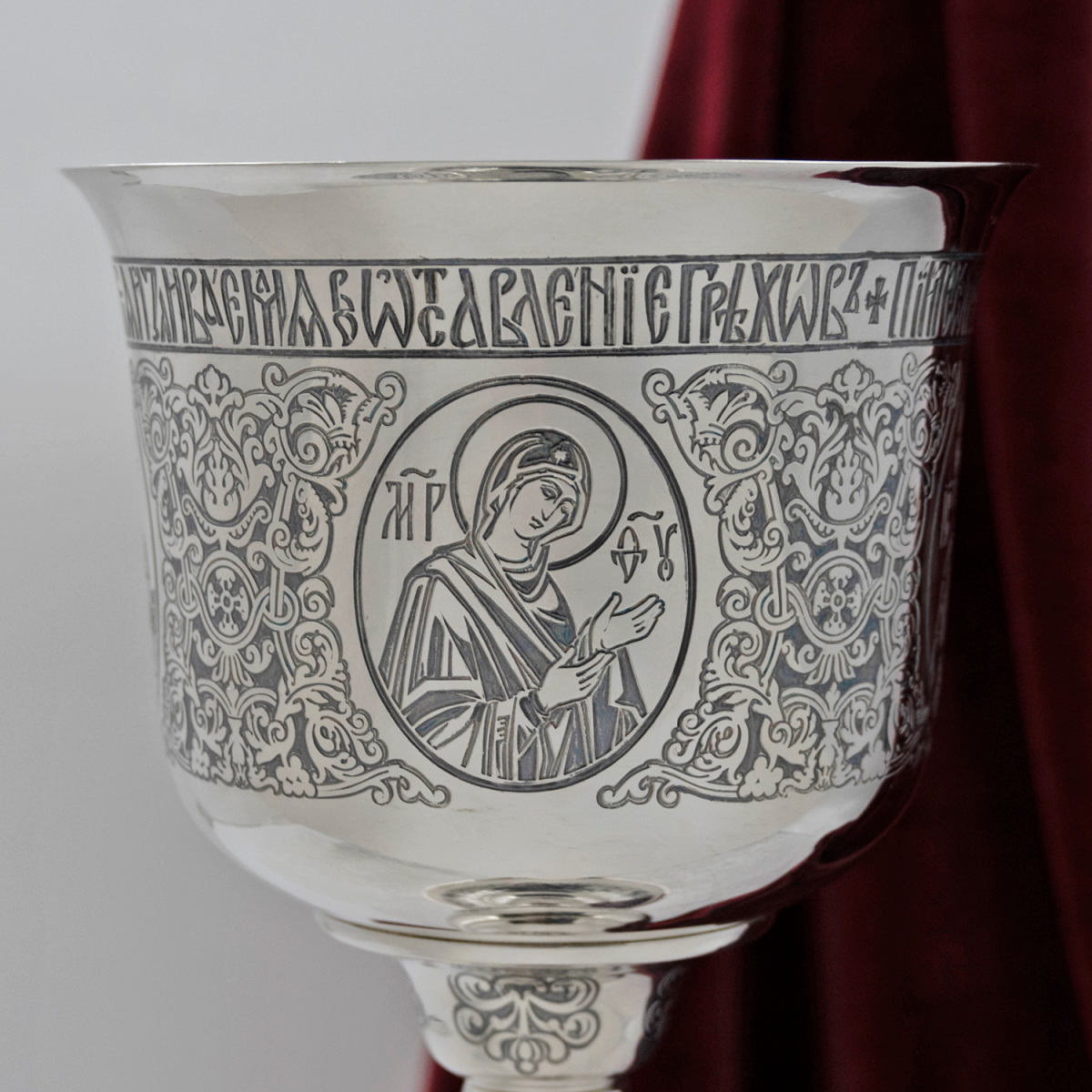 Потир лаконичного дизайна, объемом на 1,0 литр. Он покрыт долговечным серебрением при помощи передовой технологии – гальваника. За этим потиром просто ухаживать, чтобы вернуть ему первоначальный блеск, достаточно его просто натереть сухой мягкой тканью, после использования насухо вытирать и хранить без доступа влаги.  Орнамент и каноничные надписи на потире выполнены при помощи глубокого травления, они не сотрутся со временем. Изделие созданное руками православных мастеров ювелиров с любовью и молитвой. Потир продается в презентабельной кожвиниловой упаковке с бархатным ложементом.