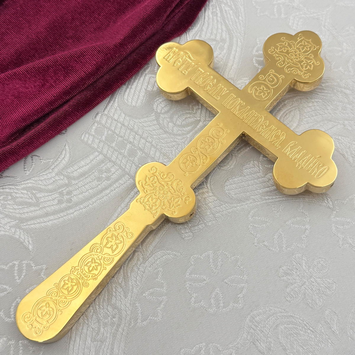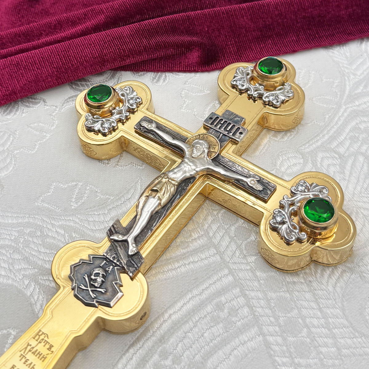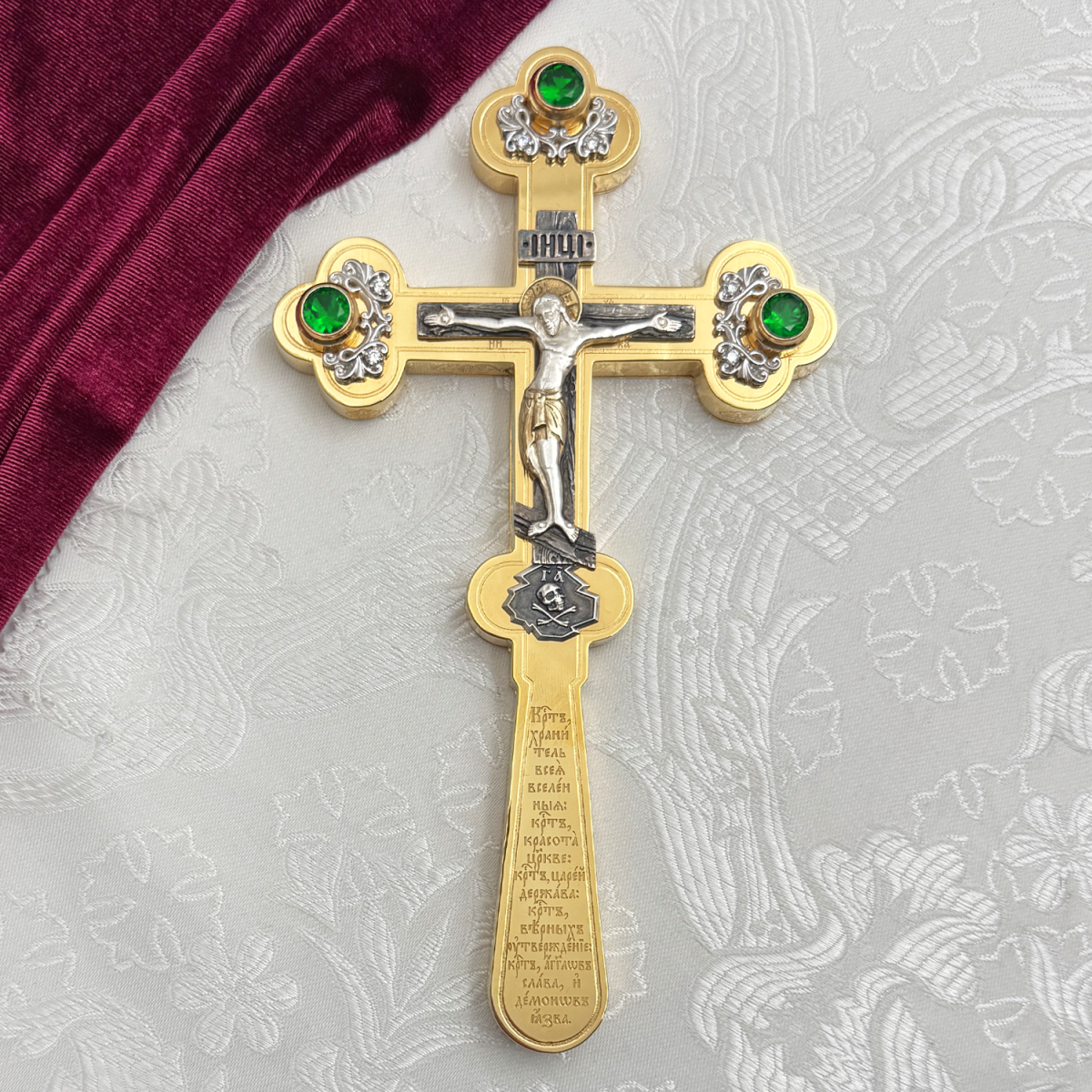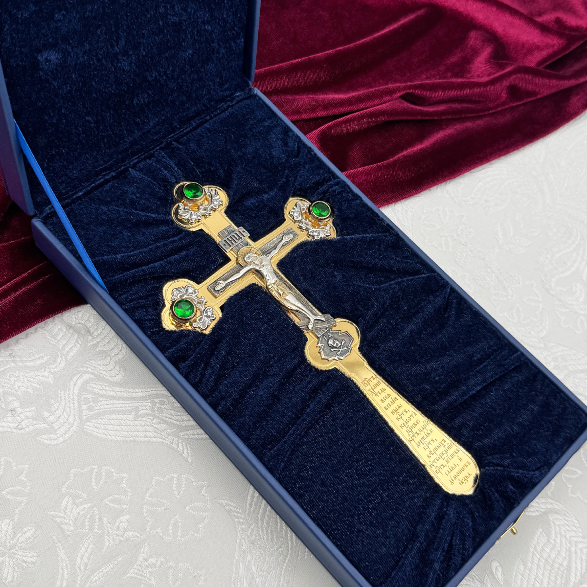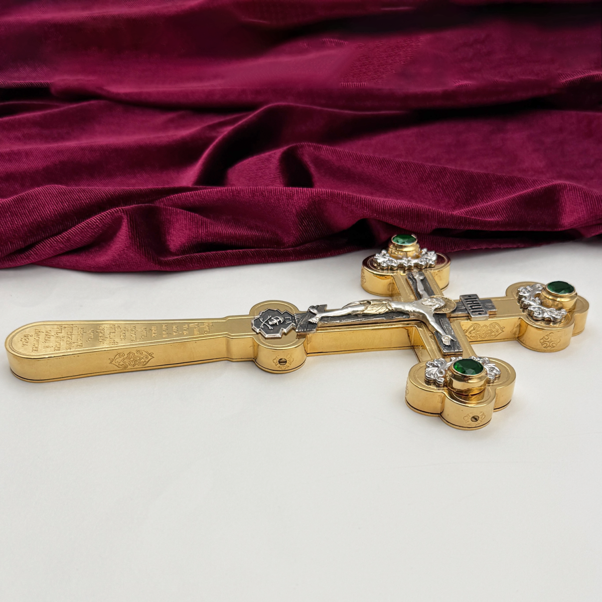 - Крест требный латунный в позолоте с зелеными камнями 2.7.0619лпр