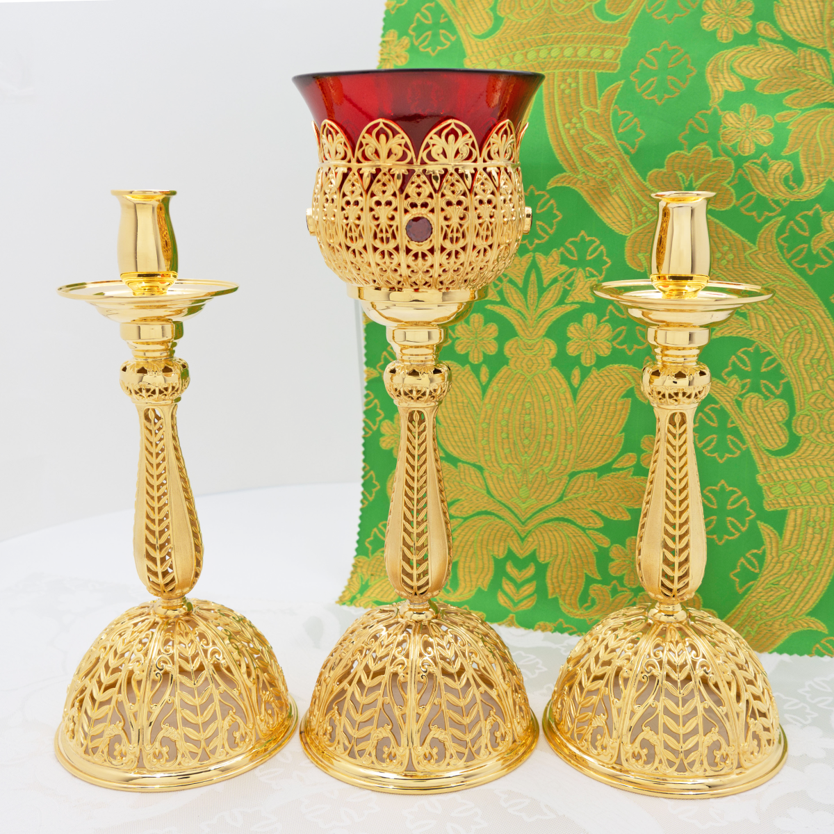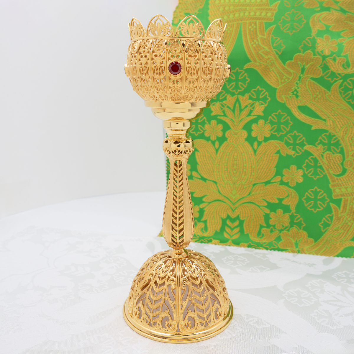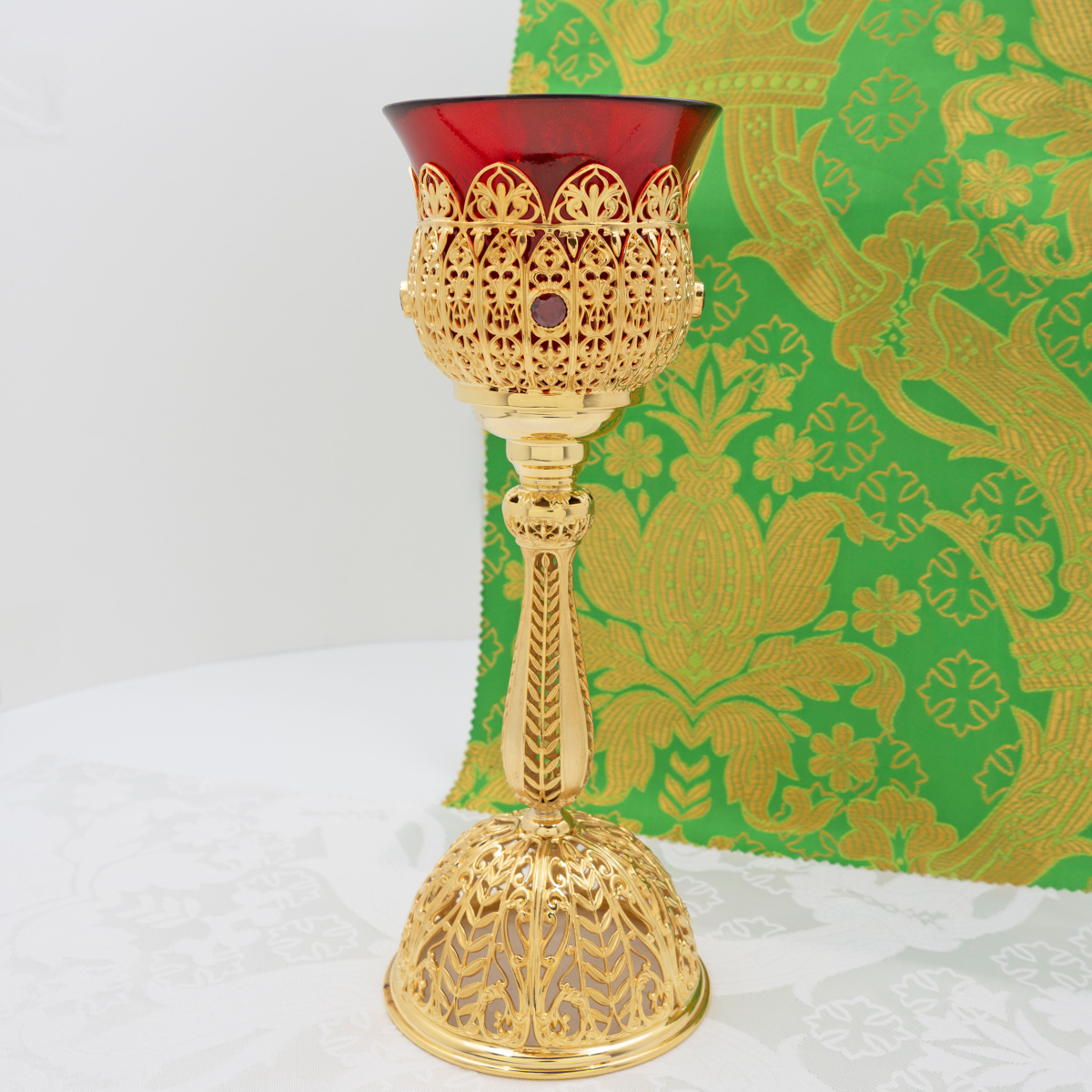 - Напрестольный набор лампада и подсвечники с красными камнями в позолоте 2.7.0943лп-К