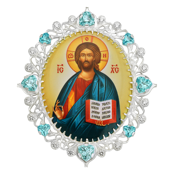 Икона на митру изготовлена из латуни и покрыта качественным серебрением, нанесенным гальваническим способом. Такая технология нанесения гарантирует неизменный вид изделия на очень длительный срок. Образ выполнен по специальной технологии нанесения цветного изображения на латунную основу и покрыт составом, предохраняющим его от механических повреждений и воздействия света. Нарядная рамка изготовлена в виде растительного орнамента на просвет и декорирована вставками камней-Фианитов очень эффектной огранки триллион отличного качества ручной закрепки. В комплекте таких икон четыре штуки: Господь Вседержитель, Крест, Богородица, Иоанн Креститель и отдельно пятая - верхняя икона с образом Спаса Нерукотворного или Святой Троицы по заказу. К комплекту так же может быть подобран крест на митру для архиереев. Образа святых по вашему заказу могут быть любыми. Если вы решили преподнести такой набор в подарок священнику, то возможна его упаковка в презентабельную подарочную коробку из кожвинила с бархатным ложементом.