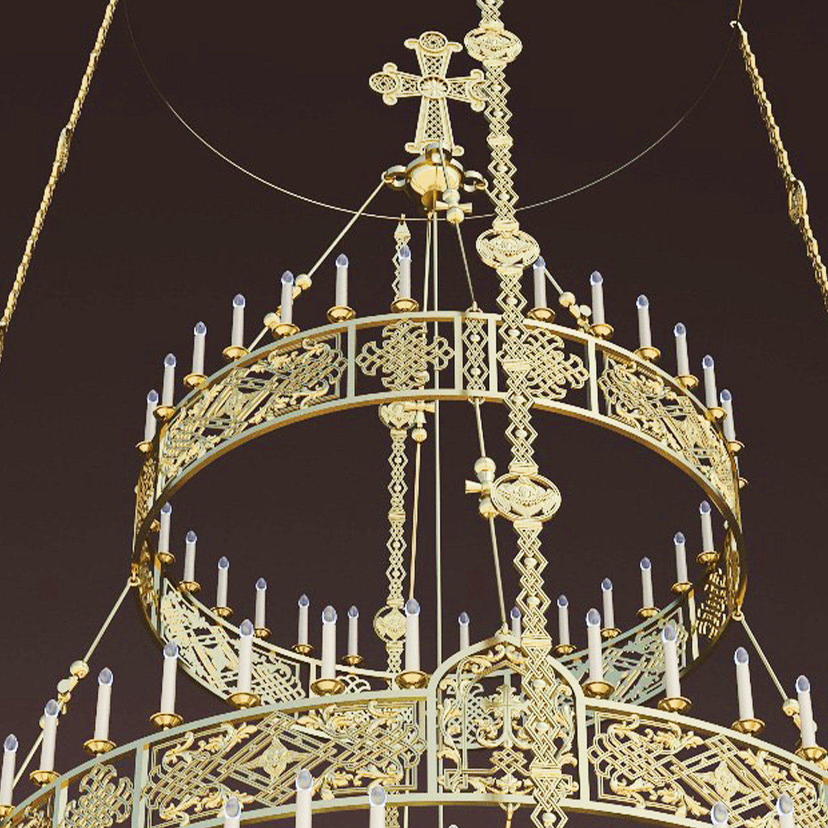 Данный хорос оснащён свечами по диаметру каждого яруса. Для изготовления данного хороса используется латунь и алюминий, сверху изделие покрыто металлизацией. Состоит из 3 ярусов: нижний ярус - 293 см, средний ярус - 205 см, верхний ярус - 143 см.