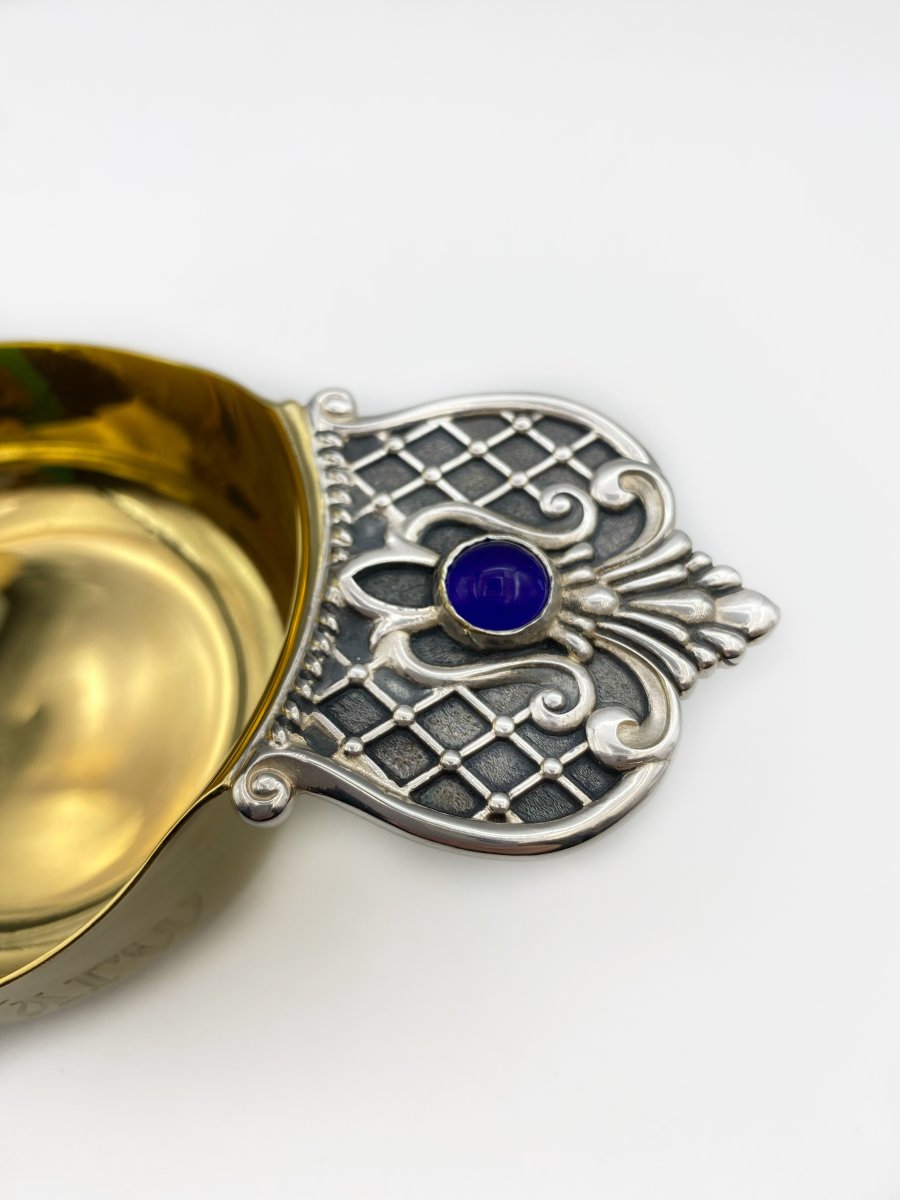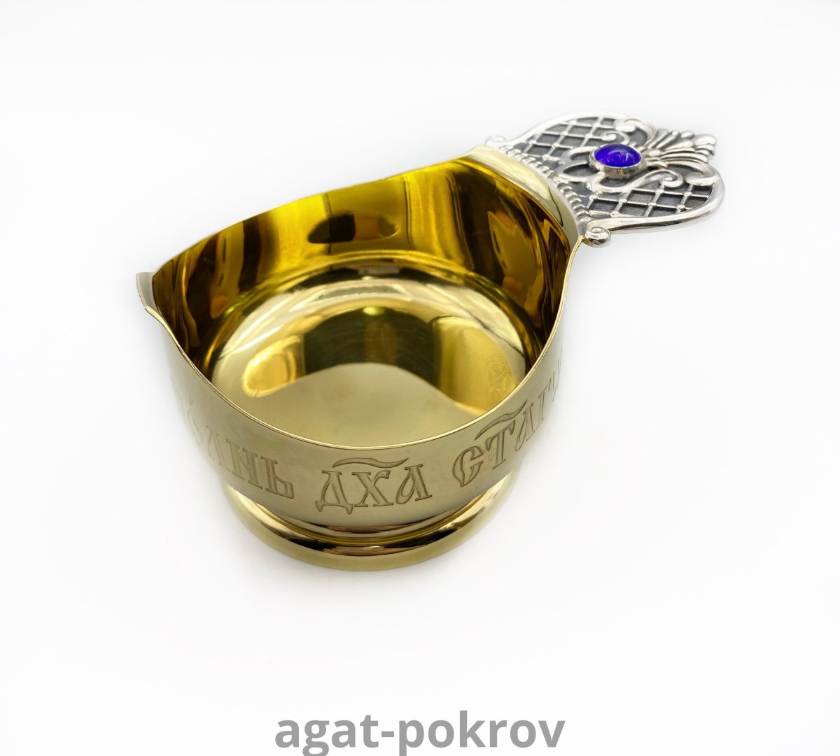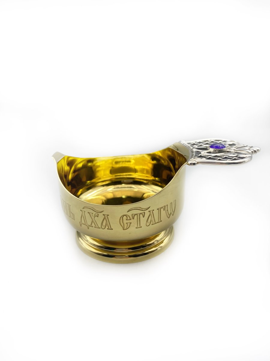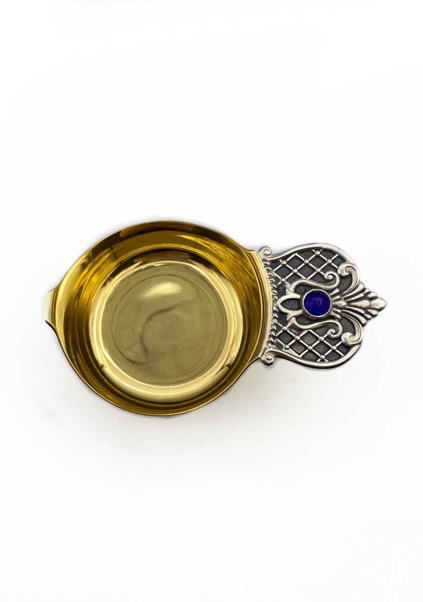 Ковш изготовлен из высококачественного ювелирного сплава, покрытого позолотой гальваническим методом, такое покрытие продлевает срок службы изделия, защищает от внешних неблагоприятных воздействий. Изделие декорировано чернением и вставкой из фианита синего цвета. Ковш продается в фирменной упаковке из экокожи с бархатным ложементом.