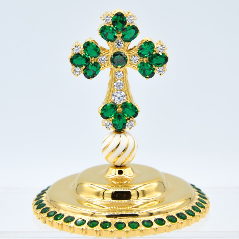 Нарядный крест на митру изготовлен из латуни и покрыт качественной поЗолотой, нанесенной гальваническим способом. Такая технология нанесения гарантирует неизменный вид изделия на очень длительный срок и простоту в уходе. Крест декорирован вставками камней-Фианитов отличного качества, разного размера. Все камни закреплены вручную, это гарантия того, что все они останутся на своих местах и никогда не возникнет проблема замены выпавших камней. Крест установлен на литьевой шарик, акцентированный ручным нанесением качественной эмали. Изделие упаковано в презентабельную кожвиниловую упаковку с бархатным ложементом.