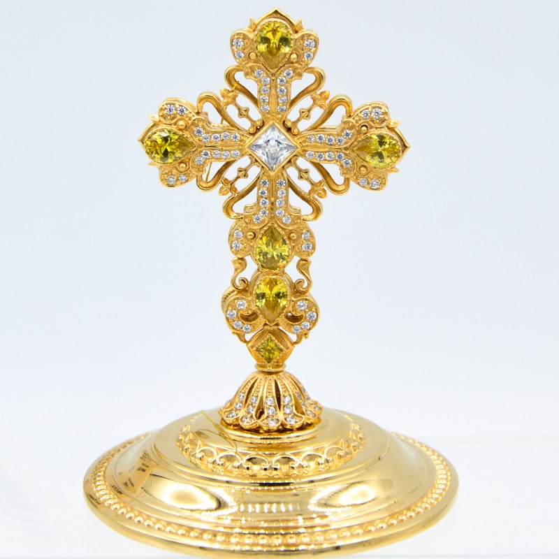 Крест на митру изготовлен из латуни и покрыт качественной поЗолотой, которая очень долго остается в неизменном виде. Изделие богато декорировано россыпью камней-Фианитов ручной закрепки. Крест продается в презентабельной кожвиниловой упаковке с бархатным ложементом.
