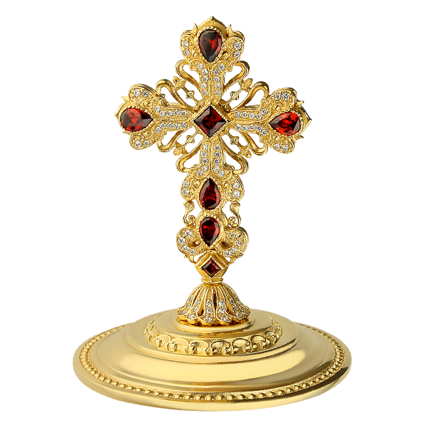 Крест на митру изготовлен из латуни и покрыт качественной поЗолотой, которая очень долго остается в неизменном виде. Изделие богато декорировано россыпью камней-Фианитов ручной закрепки. Крест продается в презентабельной кожвиниловой упаковке с бархатным ложементом.