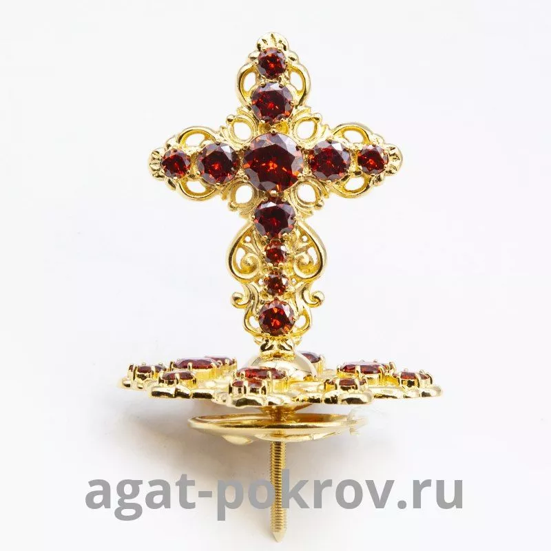 Крест на митру изготовлен из латуни и покрыт качественной поЗолотой, которая очень долго остается в неизменном виде. Изделие богато декорировано россыпью камней-Фианитов ручной закрепки. Крест продается в презентабельной кожвиниловой упаковке с бархатным ложементом.