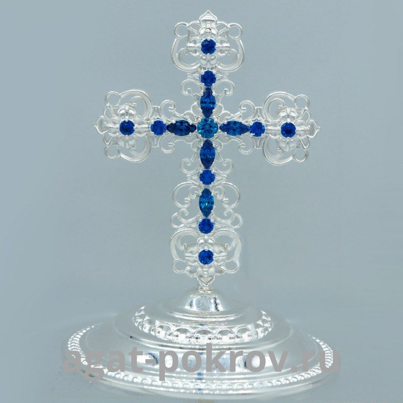 Крест на митру изготовлен из латуни и покрыт серебрением 925 пробы, нанесенным  гальваническим способом. Такая технология нанесения гарантирует неизменный вид изделия на очень длительный срок и простоту в уходе. Крест декорирован вставками камней-фианитов высокого качества. Все камни закреплены вручную, что гарантирует их нахождение на своих местах все время пользования.  Изделие продается в фирменной упаковке из экокожи с бархатным ложементом.