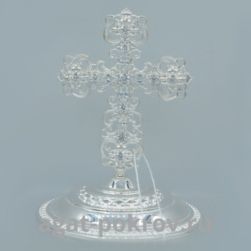 Крест на митру изготовлен из латуни и покрыт серебрением 925 пробы, нанесенным гальваническим способом. Такая технология нанесения гарантирует неизменный вид изделия на длительный срок и простоту в уходе. Крест декорирован вставками камней-фианитов высокого качества. Все камни закреплены вручную, что гарантирует их нахождение на своих местах все время пользования. Изделие продается в фирменной упаковке из экокожи с бархатным ложементом.