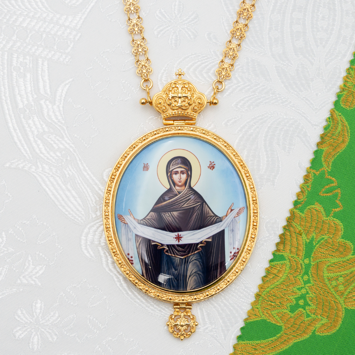 Панагия с цепью изготовлена из высококачественного ювелирного сплава, специально созданного для производства ювелирных изделий. Она покрыта качественной позолотой при помощи гальваники. Нанесенное таким способом покрытие очень надежное и долговечное, благодаря ему первоначальный вид изделия сохранится в неизменном виде на длительный срок. Панагия изготовлена исключительно при помощи ручного труда, образ выполнен при помощи специальной технологии нанесения цветного изображения на металлическую основу, оно покрыто защитным составом, предохраняющим его от выгорания цвета и повреждений.
