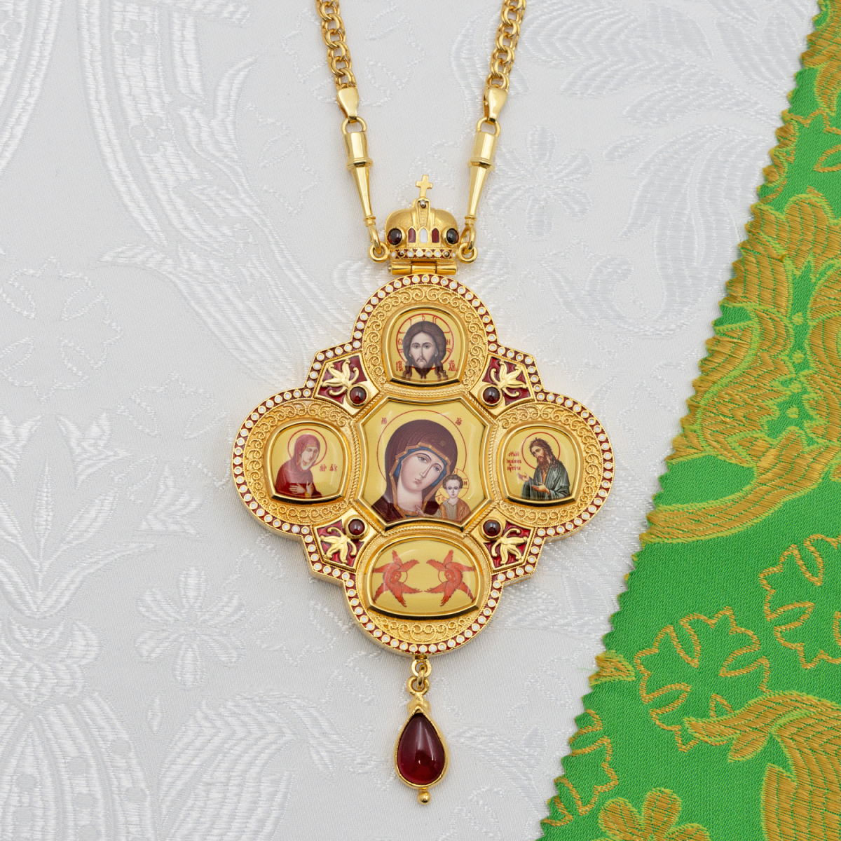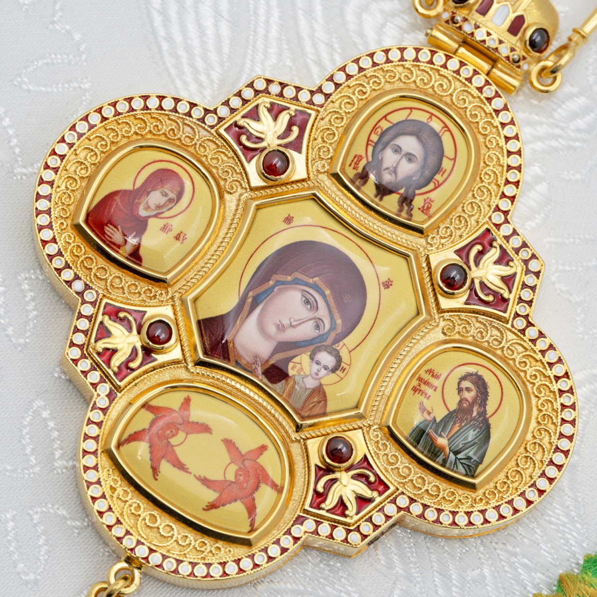 Панагия с цепью изготовлена из высококачественного ювелирного сплава, специально созданного для производства ювелирных изделий. Она покрыта позолотой при помощи гальваники. Нанесённое таким способом покрытие очень надёжное и долговечное, благодаря ему первоначальный вид изделия сохранится неизменным на длительный срок. Панагия изготовлена вручную, Образы выполнены при помощи специальной технологии нанесения цветного изображения на металлическую основу и покрыты защитным составом, предохраняющим от выгорания цвета и повреждений. Лицевая сторона панагии декорирована эмалью. Красный кварц и белые фианиты ручной закрепки дополнительно украшают изделие.