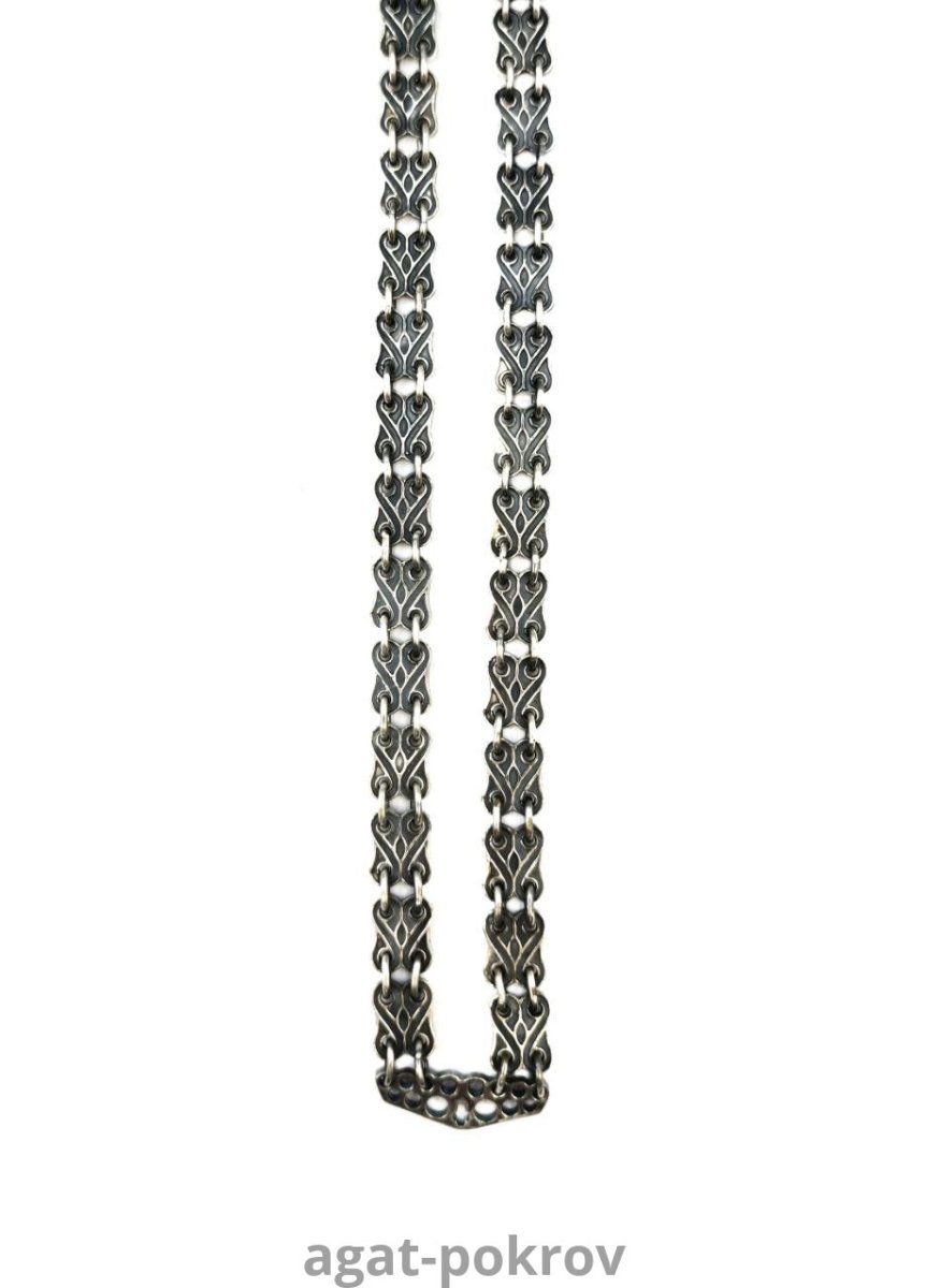 Цепь изготовлена из ювелирного сплава, покрытого серебрением гальваническим методом, такое покрытие продлевает срок службы изделия, защищает от внешних неблагоприятных воздействий. Цепь декорирована чернением.